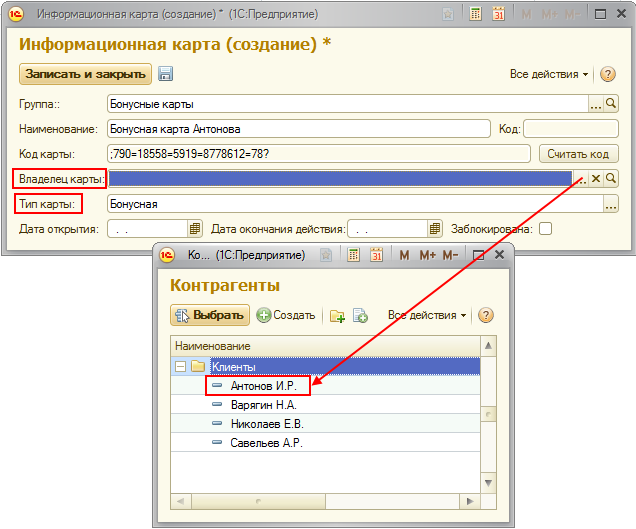 Владелец карты – из справочника «Контрагенты» выбираем нашего постоянного клиента Антонова И.Р.