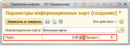 В данном регистре сведений устанавливаем порог суммы и процент бонусов для информационных (бонусных) карт. В регистр сведений «Параметры информационных карт» необходимо добавить для каждого порога отдельную строку, в которой нужно заполнить следующие реквизиты: