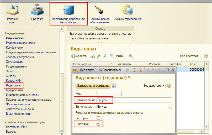 После регистрации информационной карты «Бонусная» и настройки ее параметров необходимо добавить новый вид оплаты «Бонусами», для того, чтобы при оплате заказа можно было оплатить часть суммы от заказа накопленными бонусами. На закладке «Нормативно – справочная информация» панели навигации отрываем справочник «Виды оплат» и создаем новый вид оплат «Бонусы». При помощи соответствующего признака отмечаем режим, в котором действует данный вид оплаты. В кафе «Пепперони» используется режим «Фаст-фуд».