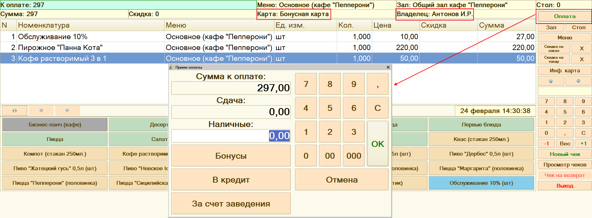 Далее, рассмотрим оплату заказа бонусами. Предположим, что клиент Антонов И.Р. вновь посетил кафе «Пепперони» и сделал заказ: пирожное «Панна Котта» и напиток «Кофе 3 в 1» на сумму 297 тг. При помощи считывателя магнитных карт идентифицируем бонусную карту, предъявленную Антоновым И.Р. После идентификации карты, в верхней части формы заказа отображается вид карты (Бонусная карта) и ее владелец (Антонов И.Р.).