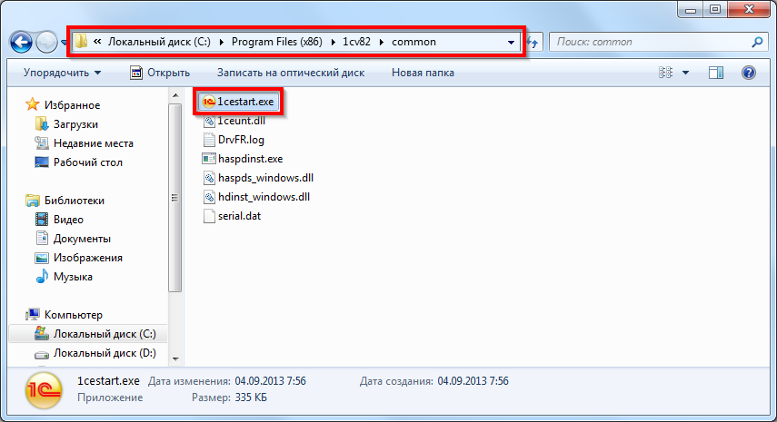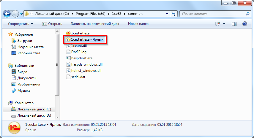 В рассматриваемом нами примере операционная система 64-битная, поэтому файл «1cestart.exe» должен располагаться в каталоге «C:\Program Files (x86)\1cv82\common\».