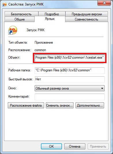 Все параметры запуска будем добавлять в поле «Объект» после строки «C:\Program Files (x86)\1cv82\common\1cestart.exe».