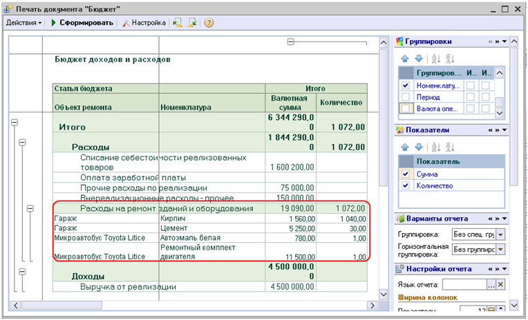 В нашем случае можно будет для каждого подразделения по определенному проекту запланировать затраты на ремонт различных основных средств в разрезе произвольного количества номенклатурных позиций.