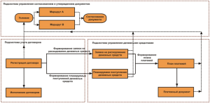 - связь с подсистемой казначейства через формирование заявок на расходование и документов планирования поступлений денежных средств на основании ожидаемых платежей по договорам;
