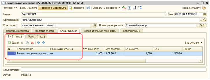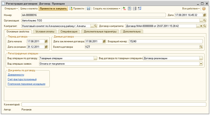 Центральным документом подсистемы является документ «Регистрация договоров».