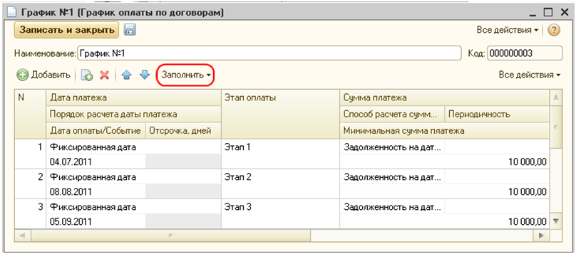 Для описания и хранения графиков платежей используется специальный справочник «Графики оплаты по договорам».