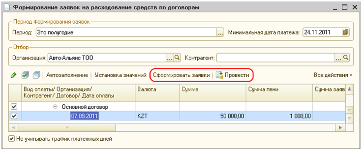 В обработке необходимо задать период, за который будут сформированы заявки, минимальную дату платежа (по данной дате рассчитывается сумма пени) и, в случае необходимости, задать отбор по организации и контрагенту. Табличная часть обработки автоматически заполнится суммами платежей, рассчитанными за выбранный период.