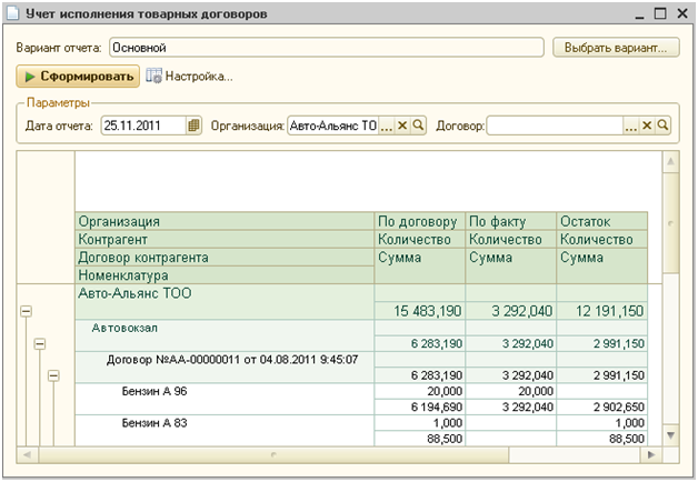 Для анализа исполнения договоров в подсистеме предусмотрен специальный отчет «Учет исполнения товарных договоров», в котором выводятся сведения о сумме по договору в целом, сумме фактической оплаты и сумме остатка.