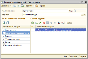 Откроем созданный элемент справочника Группы пользователей – «Бухгалтерия».