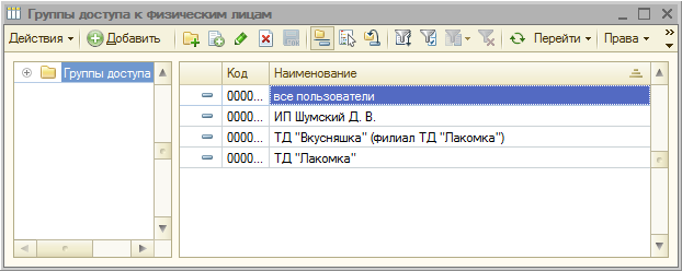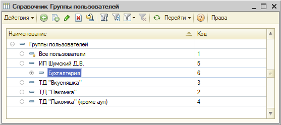 Открывается окно со списком созданных групп пользователей (из справочника Группы пользователей).