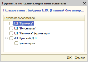 В данном списке необходимо установить флажки у тех групп, в которые будет входить данный пользователь. Включим пользователя «Громова» в состав группы «Бухгалтерия». Можно включить пользователя одновременно в несколько групп.