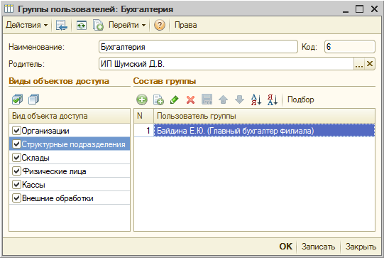 Откроем созданный элемент справочника Группы пользователей – «Бухгалтерия».