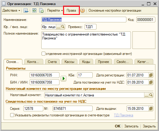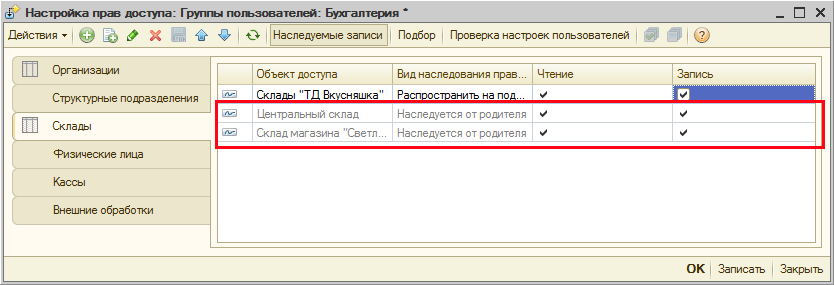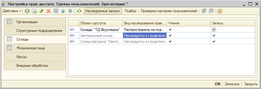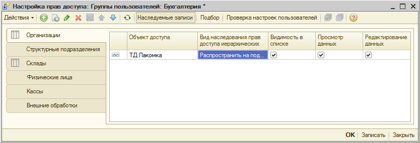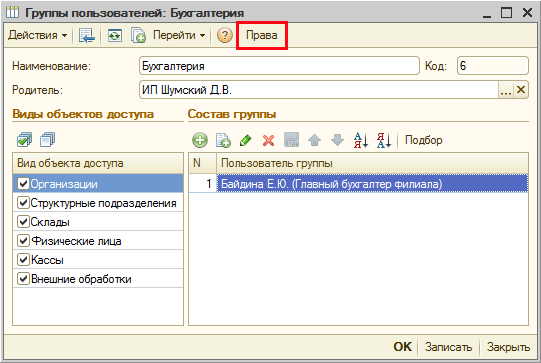 В формах элементов и списков справочников, входящих в виды объектов доступа (Организации, Подразделения организаций, Склады, Кассы, Группы доступа физических лиц и Внешние обработки), в верхней кнопочной панели доступна кнопка «Права», которая открывает окно редактирования прав на уровне записей.