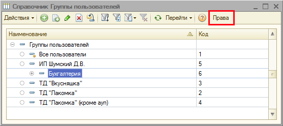 Спозиционируемся на нужном элементе справочника и нажмем кнопку «Права» на верхней кнопочной панели.