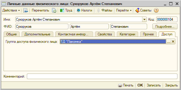 Для того, чтобы указать, к какой группе доступа из данного справочника относится физическое лицо, необходимо в форме элемента справочника Физические лица на закладке «Доступ» указать элемент из данного справочника.