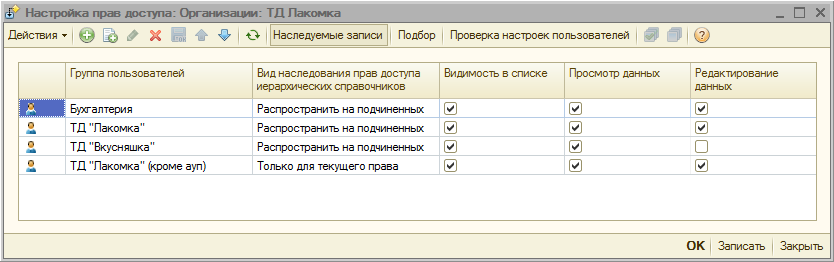 Обработка настройки прав доступа позволяет для каждого вида объектов доступа, разрешенного для данной группы, установить настройки на уровне записей: