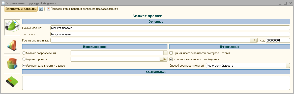 На закладке «Основное» заполняются основные характеристики бюджета – его наименование (как он отображается в документах), заголовок (как он отражается в отчетах). В соответствующем реквизите можно составить подробный комментарий по назначению бюджета.