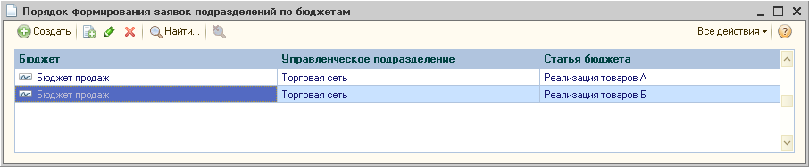 В данном регистре сведений указывается перечень статей бюджетов и подразделения, которые имеют право заполнять их. В дальнейшем, когда будет оформляться заявка на формирование бюджета от подразделения, для которого настроены такие ограничения, в заявке будут видны только выбранные статьи. Если ограничений по подразделению не предусмотрено, то в заявке этого подразделения будут видны все статьи бюджета.