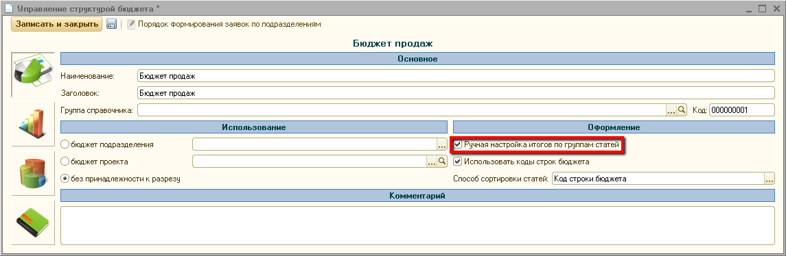 В группе реквизитов «Оформление» указывается, как будут рассчитаны итоги по группам статей - вручную, если установлен признак «Ручная настройка итогов по группам статей», или автоматически, если данный признак не установлен. Кроме того, указывается необходимость использования кодов строк бюджета, а также способ сортировки статей бюджета.