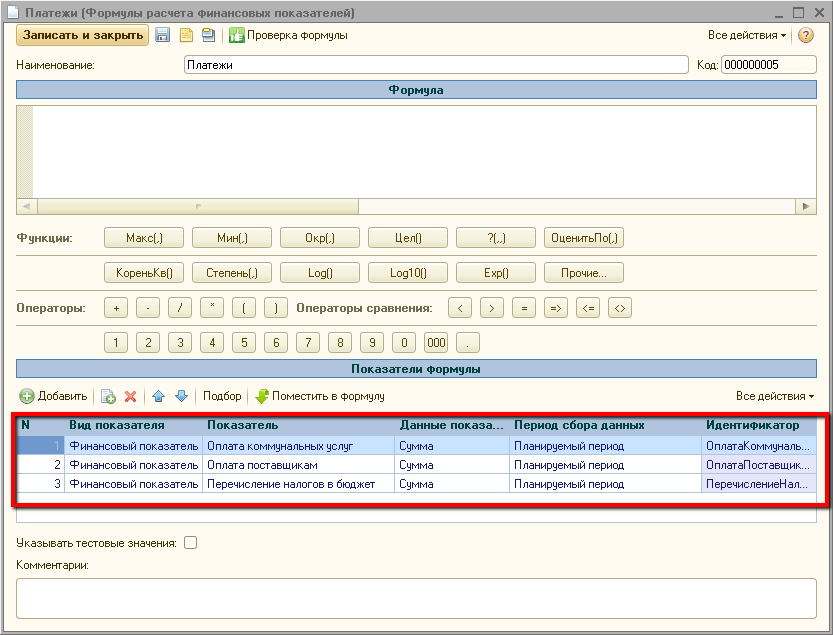 В табличной части «Показатели формулы» перечисляются статьи, которые будут участвовать в расчете итоговой строки.