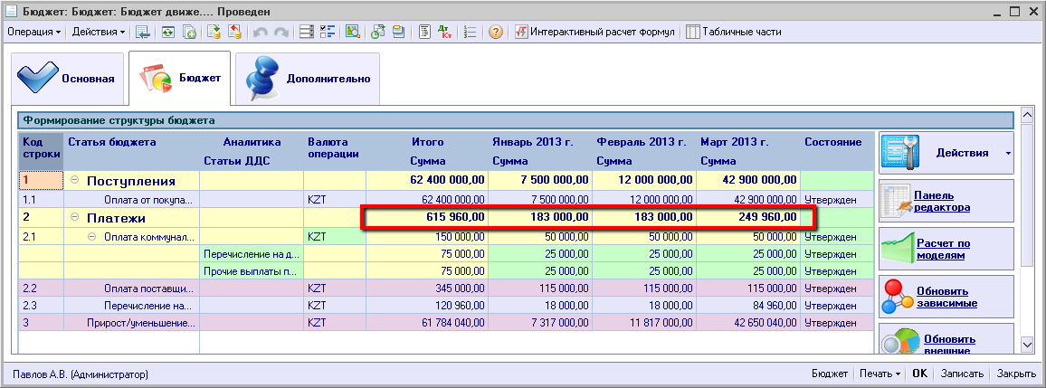 В созданном бюджете строка «Платежи» будет отражена по настроенной нами формуле. В соответствии с данной настройкой, в отчете по исполнению бюджета полученная итоговая сумма по группе расходных статей будет отражена аналогично.