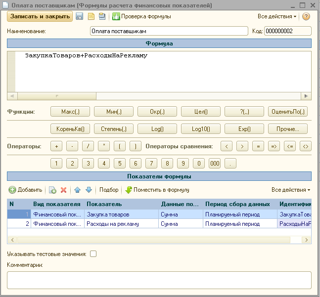 Формула описывается в виде выражения, составленного по правилам встроенного языка платформы 1С:Предприятие. При создании формулы можно использовать как конкретные значения строк и чисел, так и переменные, ссылающиеся на показатели формулы. Для того, чтобы поместить переменную, соответствующую показателю, в формулу необходимо либо ввести с клавиатуры ее идентификатор, либо выделить строку с нужным показателем и затем выбрать команду «Поместить в формулу». Если необходимо добавить сразу несколько показателей, установив между ними операцию сложения, вычитания, умножения или деления, то можно выделить сразу несколько показателей и нажать кнопку «Поместить в формулу». После этого система задаст вопрос о подтверждении действия и предложит выбрать применяемую между этими показателями арифметическую операцию.
