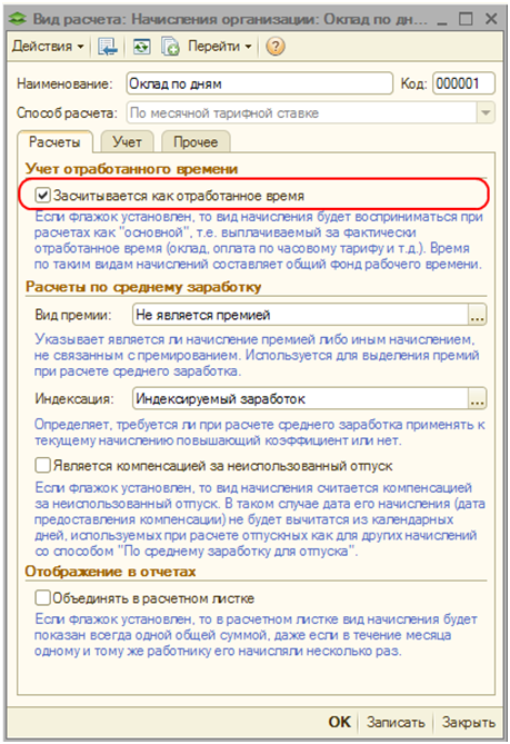 Для тех базовых видов расчета, которые являются основными начислениями и рассчитываются от отработанного времени (по месячной тарифной ставке по дням, по месячной тарифной ставке по часам, по часовой тарифной ставке и. т.п.), необходимо установить флажок «Засчитывается как отработанное время». По нему определяется количество рабочих дней за расчетный период, указанные в реквизите «Дней (часов)» в табличной части «Начисления» документа «Начисление зарплаты работникам организаций».