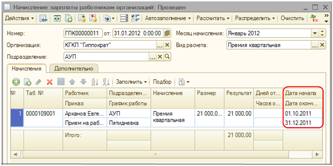 Например, если в январе 2012 сотруднику была начислена премия за 2011 год, то в расчет среднего заработка за каждый расчетный месяц должна быть включена 1/12 суммы премии. Если же в январе была начислены квартальная премия за предыдущий квартал, то в расчет будет включена 1\3 суммы премии. Период, за которые начислена премия, определяется по датам начала и окончания, указанным в документе «Начисление зарплаты работникам организаций» в строке премии.