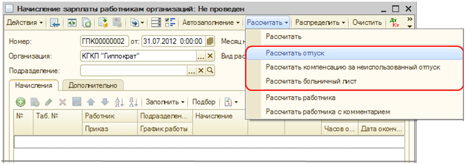 Для того, чтобы рассчитать средний заработок сотрудника и зависящее от среднего заработка начисление, необходимо создать документ «Начисление заработной платы организаций». В шапке документа указывается дата выполнения расчета, месяц начисления, организация и при необходимости подразделение, сотруднику которого будет начисляться сумма. Далее, в меню, открываемом при нажатии на кнопку «Рассчитать» командной панели документа, выбирается необходимый вариант расчета: «Рассчитать отпуск», «Рассчитать компенсацию за неиспользованный отпуск» или «Рассчитать больничный лист».
