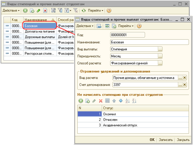Виды стипендий и выплат хранятся в специальном справочнике «Виды стипендий и прочих выплат студентам».