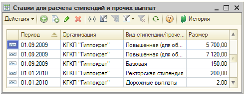 После добавления видов стипендий и прочих начислений, по которым планируется вести расчеты, необходимо установить размеры ставок для этих начислений. Для этого в системе предусмотрен регистр сведений «Ставки для расчета стипендий и прочих выплат».