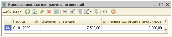 Размеры основной стипендии и стипендии подготовительного курса предварительно заносятся в регистр сведений «Базовые показатели расчета стипендий». В регистре указывается дата начала действия показателя и размер.