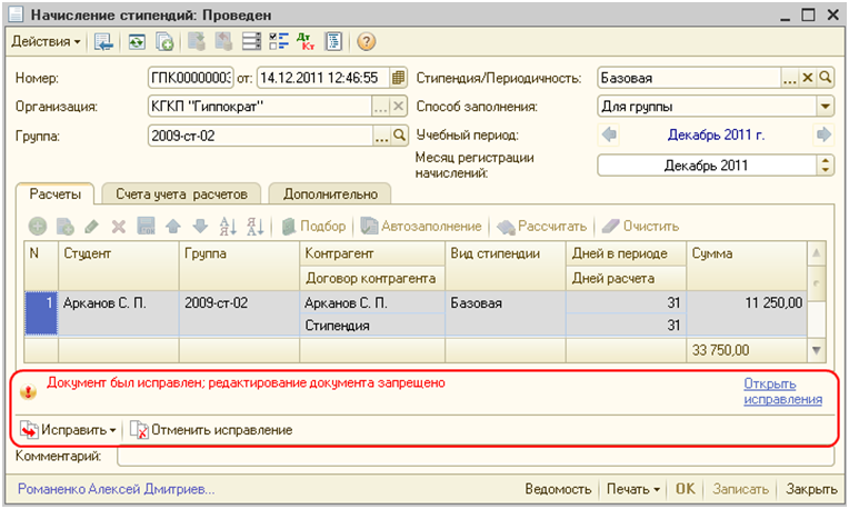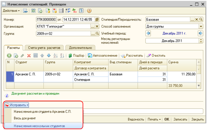 В документе реализован механизм, позволяющий исправлять начисления, зарегистрированные документом, не изменяя сам документ, что позволяет при необходимости отследить, какая сумма была начислена первоначально. В левом нижнем углу формы документа «Начисление стипендии» расположена кнопка «Исправить», при нажатии на которую открывается подменю, определяющее ввод исправления для всего документа, для определенного студента или для списка студентов.