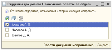При выборе исправления для студента или для всего документа, документ-исправление формируется без дополнительных действий. При выборе исправления для списка студентов открывается форма, где необходимо отметить студентов, начисления для которых необходимо исправить.