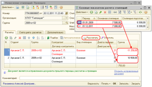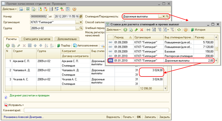 При отражении документа в бухгалтерском учете, регистрируется кредиторская задолженность перед контрагентами на счете, указанном в поле Счет расчетов с контрагентами (по кредиту проводки), в корреспонденции со счетом и аналитикой, указанными в группе Расходы (по дебету проводки), на сумму рассчитанной стипендии. В оперативном учете при проведении документа отражаются суммы к оплате в разрезе видов стипендий и учебных периодов.