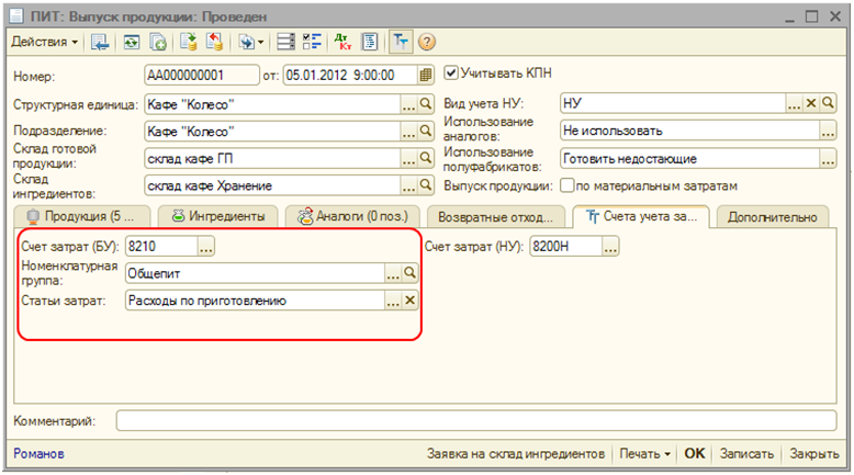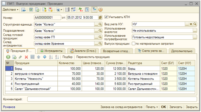 В табличной части «Продукция» вводится список продукции, подлежащей приготовлению, а на основании рецептур продукции формируется список ингредиентов, которые должны быть израсходованы на приготовление. При проведении документа списываются все ингредиенты с учетом вложенных рецептур (для ингредиентов — полуфабрикатов) и замены ингредиентов аналогами, а также приходуется готовая продукция, при этом выпуск приготовленных полуфабрикатов не регистрируется.