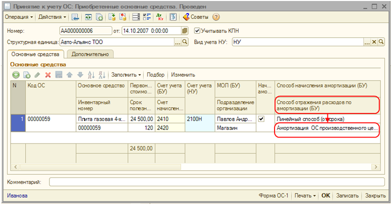 Чтобы затраты по износу оборудования включались в себестоимость выпускаемой готовой продукции и полуфабрикатов, необходимо для основного средства при принятии его к учету документом «Принятие к учету ОС» указать способ отражения расходов по амортизации.