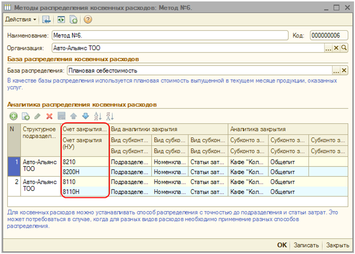 Далее необходимо задать метод распределения косвенных расходов. Для этого в справочнике «Методы распределения косвенных расходов» нужно добавить новый метод распределения, в котором выбрать базу распределения косвенных расходов «Плановая себестоимость», а в аналитике распределения косвенных расходов указать счета 8210 «Полуфабрикаты собственного производства» и 8110 «Основное производство» для пропорционального распределения расходов на готовую продукцию и полуфабрикаты. В случае, если расходы по амортизации необходимо распределять на определенную аналитику, то для данных счетов может быть заполнена аналитика закрытия в реквизитах «Субконто закрытия 1», «Субконто закрытия 2» и «Субконто закрытия 3». В данном случае заполнение аналитики необязательно, так как указанные счета являются счетами производственного учета.
