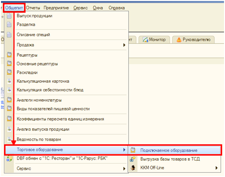 Подключение торгового оборудования в прикладном решении «1С-Рейтинг: Общепит» сводится к добавлению новых элементов в справочник «Подключаемое оборудование» и их последующей настройке.
