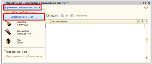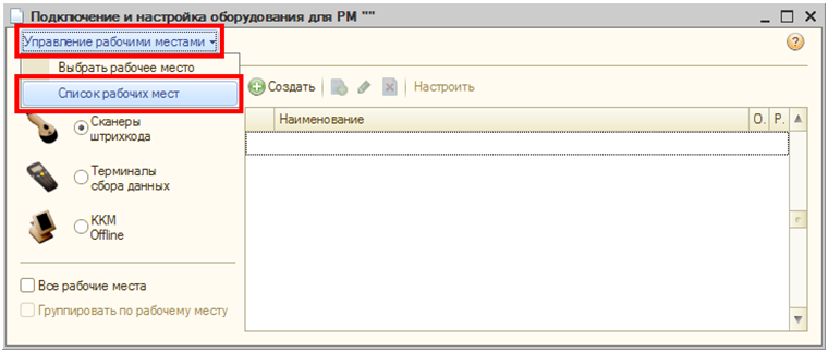 В открывшейся форме справочника на первом шаге необходимо добавить новое рабочее место, соответствующее компьютеру пользователя, к нему в дальнейшем будет привязываться подключаемое торговое оборудование. Для добавления рабочего места необходимо воспользоваться пунктом «Список рабочих мест» меню «Управление рабочими местами».