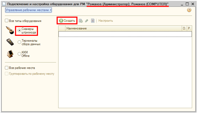 Для добавления сканера штрих-кодов необходимо выбрать соответствующий тип оборудования и нажать кнопку «Создать».