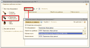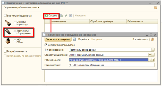 Созданное рабочее место необходимо сохранить в информационной базе при помощи кнопки «Записать и закрыть». После настройки рабочего места пользователя можно приступать непосредственно к установке и настройке сканера штрих-кодов и терминала сбора данных.