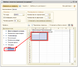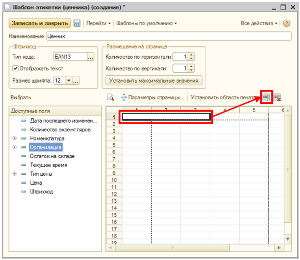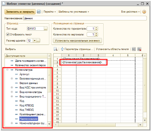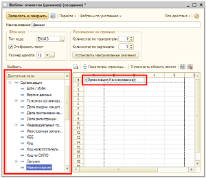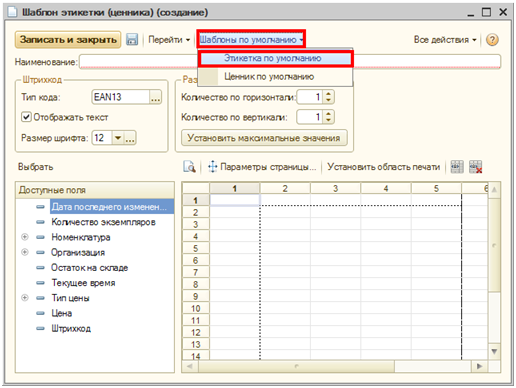 В поле табличного документа появится шаблон этикетки по умолчанию. В поле «Наименование» необходимо указать наименование шаблона этикетки. Для того, чтобы рассчитать количество этикеток заданного шаблона, которые должны поместиться на печатном листе по горизонтали и по вертикали, можно воспользоваться кнопкой «Установить максимальные значения», после этого можно сохранить созданный шаблон.