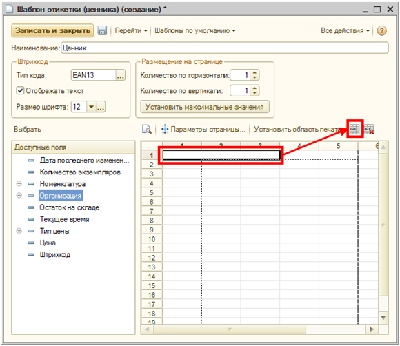 Теперь для расчета количества ценников заданного шаблона, помещающихся на листе по горизонтали и по вертикали, можно воспользоваться кнопкой «Установить максимальные значения». После этого необходимо сохранить созданный шаблон.