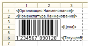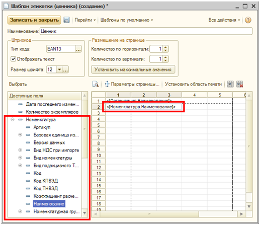 В следующие три ячейки по горизонтали добавим в шаблон наименование номенклатуры.