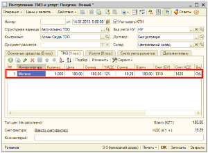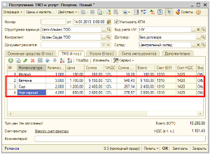 Так, в результате данных действий номенклатура «Молоко» добавится в табличную часть «ТМЗ» документа «Поступление ТМЗ и услуг», пользователю необходимо будет только ввести количество и цену.