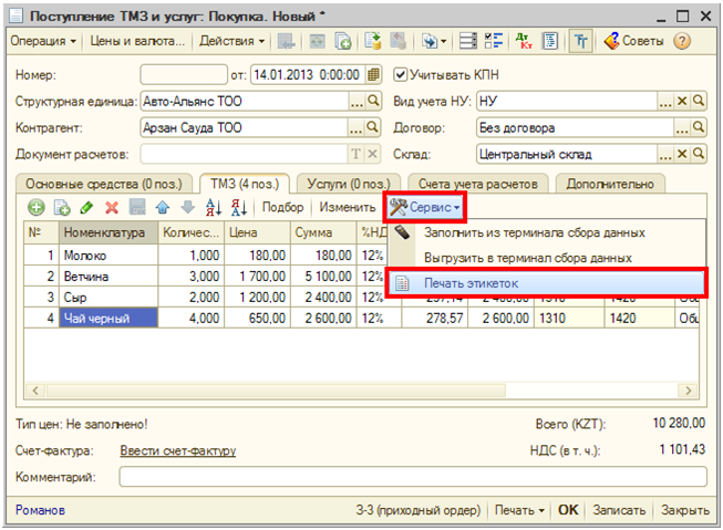 Оставшаяся часть товаров поступила без штрих-кодов. В целях автоматизации складского учета для данных товаров необходимо сгенерировать и распечатать штрих-коды. Сначала необходимо заполнить табличную часть «ТМЗ» документа «Поступление ТМЗ и услуг» перечнем поступивших товаров.