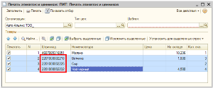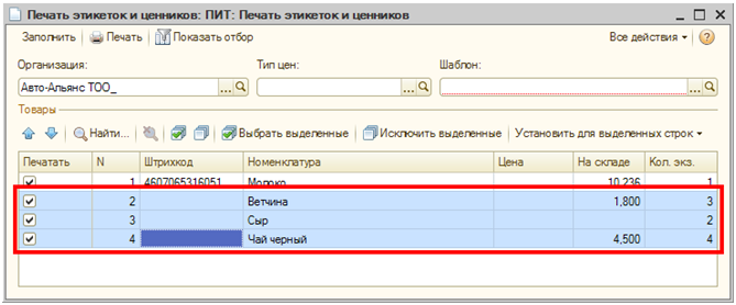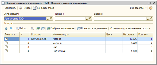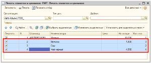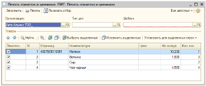 После этого будет открыта специальная обработка «Печать этикеток и ценников».