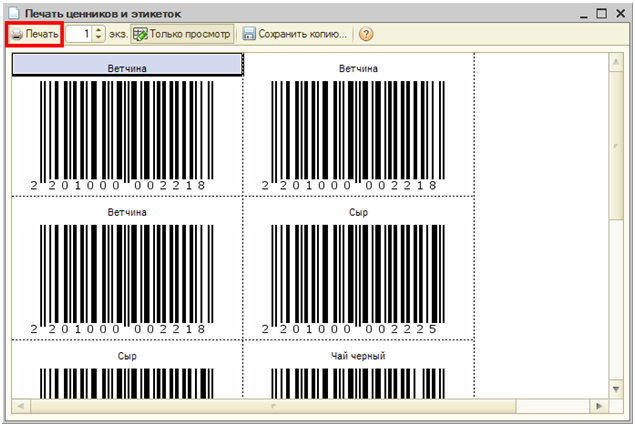 Появится окно предварительного просмотра сформированных по шаблону этикеток, при этом, количество этикеток для каждой номенклатуры будет равно количеству номенклатуры. Распечатанные этикетки необходимо будет наклеить на соответствующие товары.