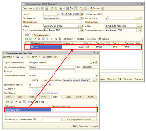 В рассматриваемом примере видно, что не у всей номенклатуры, находящейся на центральном складе, задан штрих-код. Для номенклатуры, у которой уже указан штрих-код на упаковке — необходимо добавить его в табличную часть «Штрих-код». Для удобства можно открывать элементы справочника «Номенклатура» из самого документа.